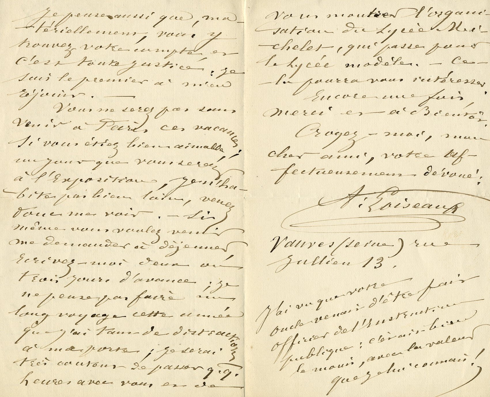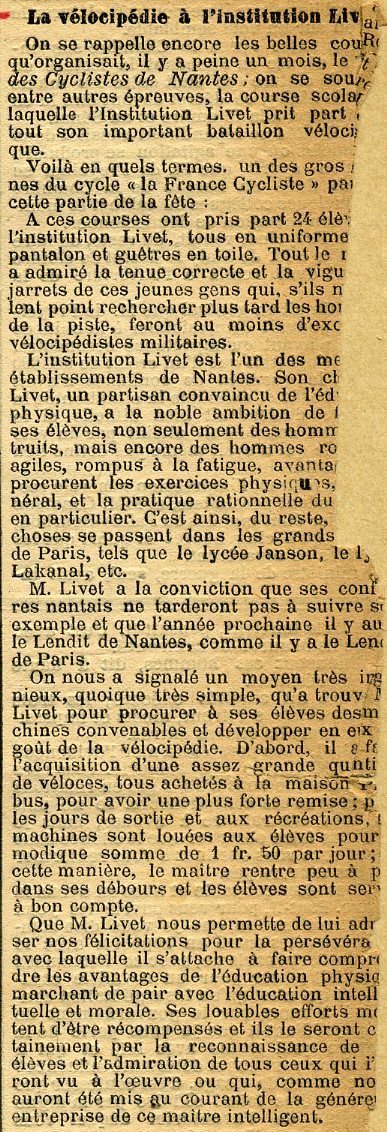 M. Livet assistait, profondément ému, à cette scène touchante. Un des plus vénérables républicains de Nantes ne put résister au désir de témoigner sa sympathie au digne chef d’institution. Il traversa la foule et vint lui serrer la main, avec ces mots qui termineront comme il convient cet article : « Bravo, monsieur Livet ! »