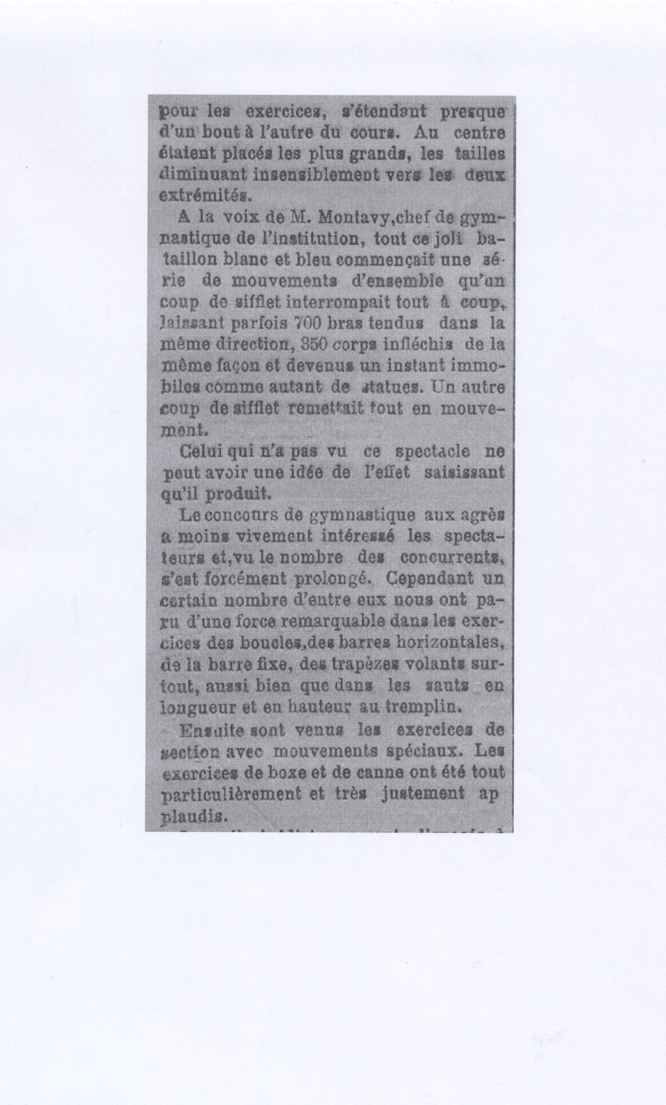 « Le soleil luisait sur les ors, les uniformes, les oriflammes, le rouge des tentures. Dès le début de la fête, les officiels et le public, sympathiques, enthousiastes furent vivement impressionnés : « tout ce joli bataillon bleu et blanc commençait une série de mouvements d’ensemble qu’un coup de sifflet interrompait tout à coup, laissant parfois 700 bras tendus dans la même direction, 350 corps infléchis de la même façon et devenus un instant immobiles comme autant de statues. Un autre coup de sifflet remettait tout en mouvement ». « Celui qui n’a pas vu ce spectacle, disait le « Progrès de Nantes et de la Loire-Inférieure » ne peut avoir une idée de l’effet saisissant qu’il produit.