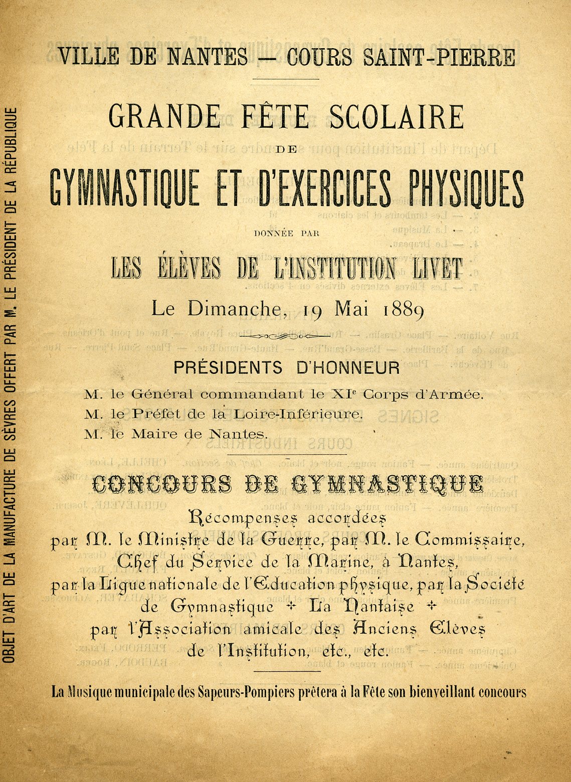 Dès que la fête eut pris fin au milieu de bravos interminables, les sections reçurent leurs récompenses, diplômes et mentions du Ministère de la guerre, médailles offertes par la Ligue Nationale de l’Éducation Physique, par l’Association des Anciens élèves, par M. le Commissaire, chef du service de la Marine, par le Cercle Pédagogique, par la Société de gymnastique « la Nantaise », par M. Bernier, chef de la Musique Municipale, laquelle s’était fait entendre à plusieurs reprises, et le héros de la fête, Léon Chelle, « qui n’avait pas cessé pendant trois heures de travailler soit à la barre fixe, soit aux barres parallèles, aux anneaux, au trapèze simple, au trapèze volant, et en compagnie de Paul Segond, au trapèze double », se vit attribuer l’objet d’art offert par le Président de la République.