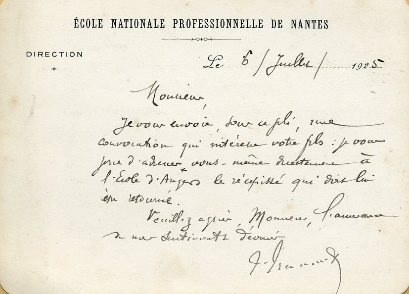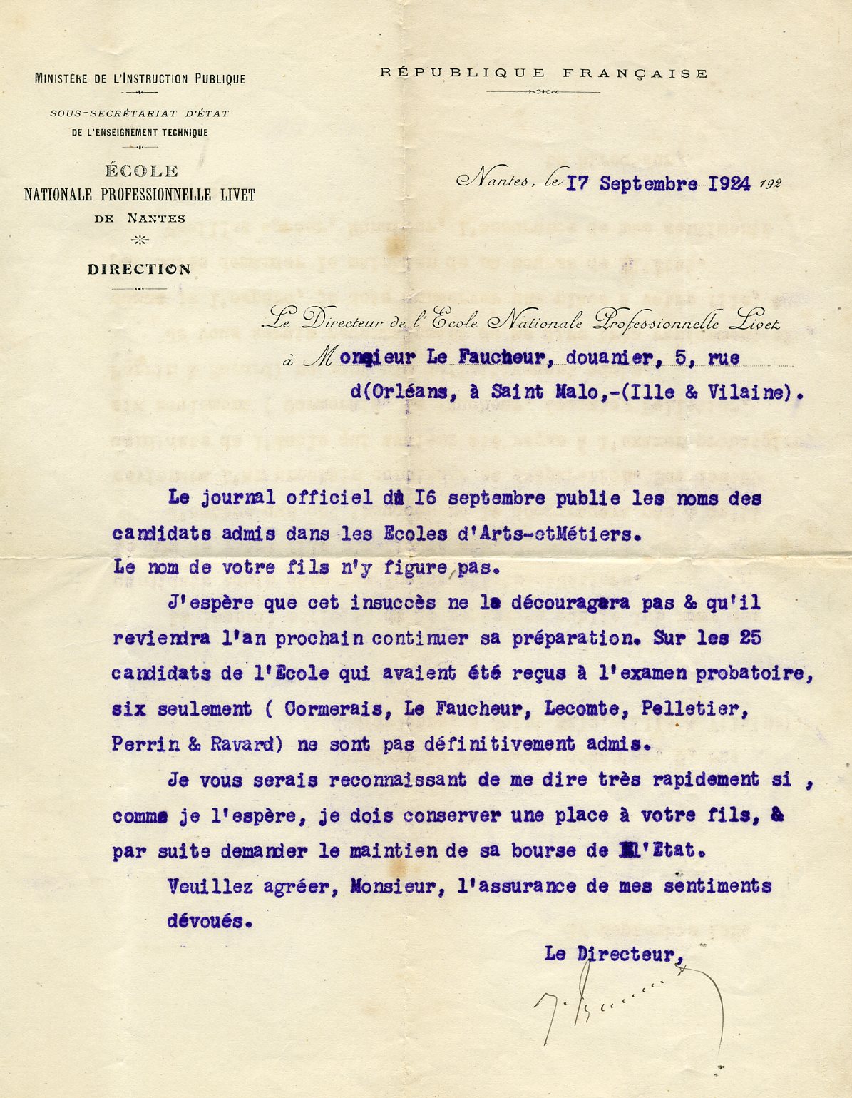 "Le relevé de notes - 403 points, avec absence de mention de l’année - et la note manuscrite qui suit non datée - rang : 543e pour 500 reçus, pour toutes les Écoles A & M sans doute - correspondent à l’année 1924. Car, la lettre du 13-7-26 indique que Le Faucheur est reçu "dans un très bon rang (4e...)" : le relevé de notes n’était pas fourni nécessairement après l’admission au concours."